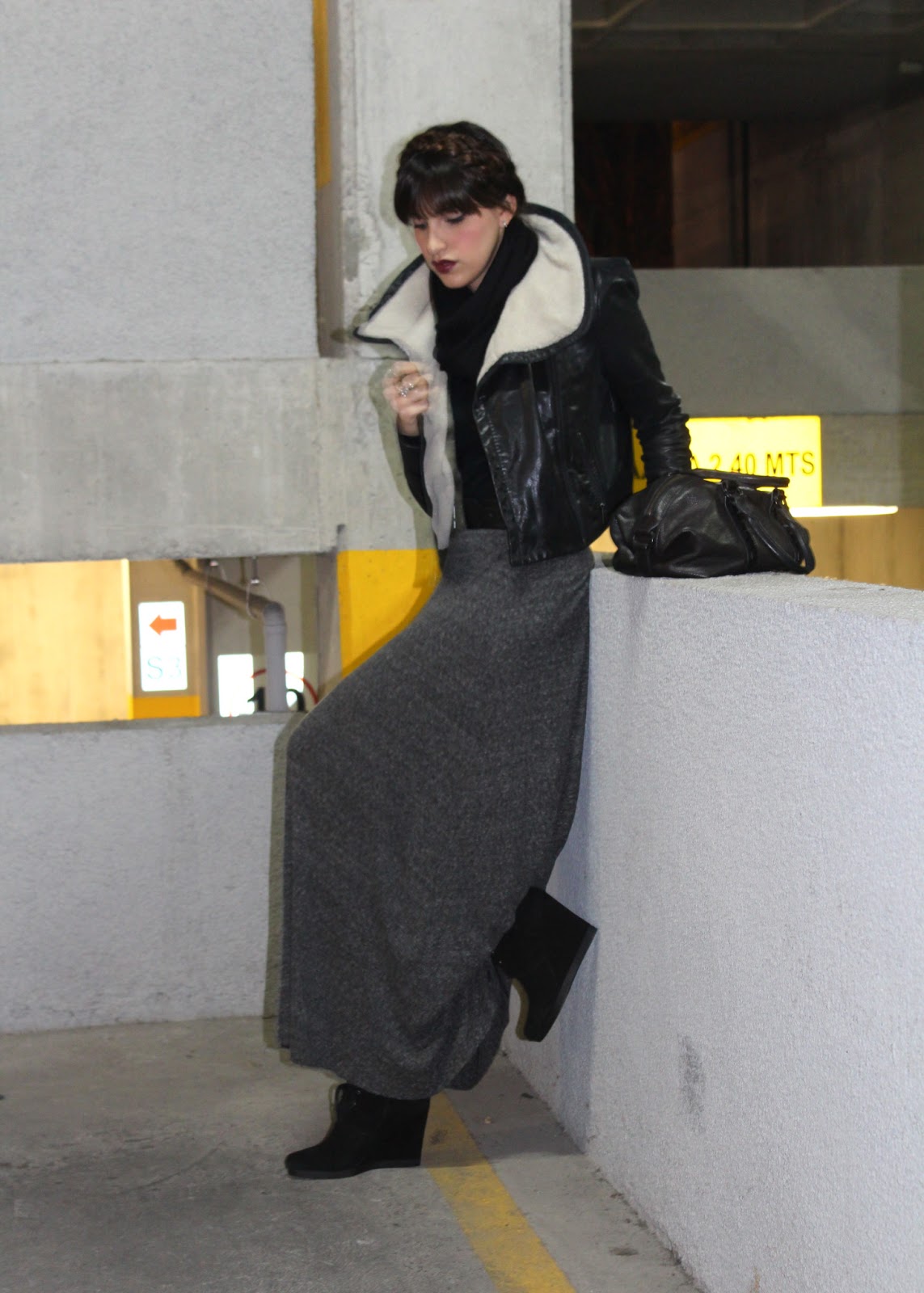 Leather biker jacket - BCBG / Sweater - Express / Jersey maxi skirt - Zara / Studded bowling bag - Kenneth Cole / Wedge booties - Nine West.